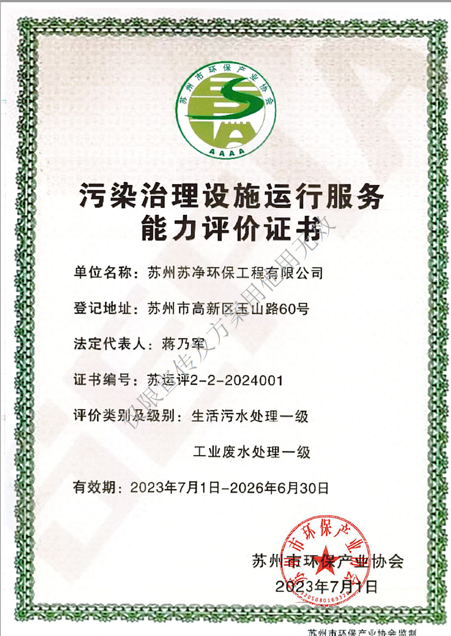 污染治理設施運行服務能力評價證書